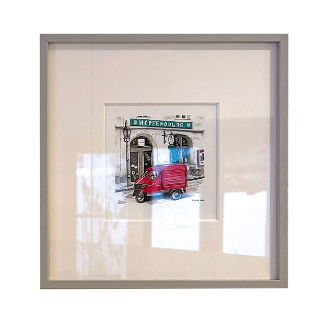 Zeichnung der Kneipe Hopfendolde, Alt-Schwabing, Feilitzschstraße 17, Schwabing, München. Premium-Digitaldruck mit Passepartout. Die Originalzeichnung ist quadratisch, ca 15x15 cm mit Passepartout und wird mit hellgrauem Rahmen verschickt.